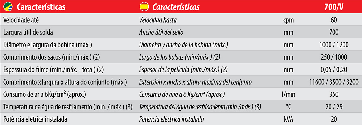 Máquina de corte e solda para a produção de embalagens com válvula lateral, composta por um desbobinador com controle de tensão e alinhamento de borda; triângulo dobrador duplo com ajustes precisos da sanfona e versatilidade nas mudanças; balança compensadora; suporte para diversos dispositivos específicos para esta embalagem; corte e solda com cabeçote de solda tipo beira lateral e redução eletrônica do tempo de solda; esteira transportadora com correias de algodão e mesa de empilhamento fixa; CLP com IHM ( colorido touch screen ) de fácil manuseio e ótima localização; com armazenamento de receitas, entre outras importantes funções para facilitar a operação e a interação do operador.