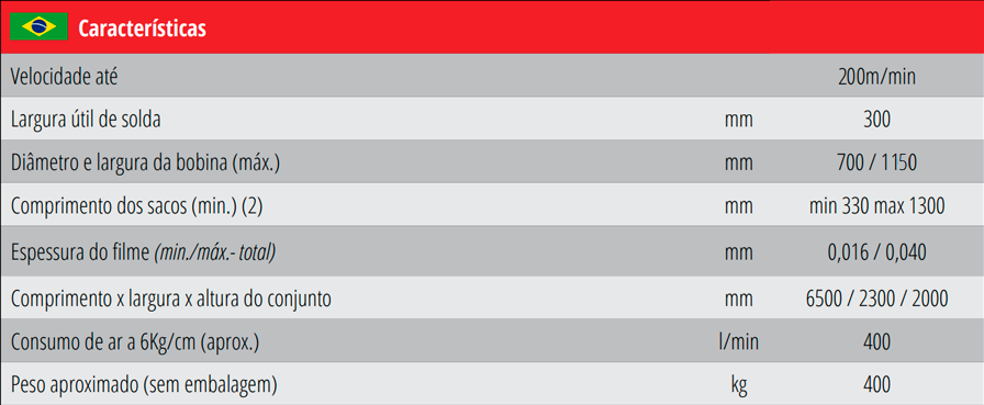 Máquina de picote e solda modelo Poliroll para produção de sacos plásticos para lixo em rolo, uma pista com velocidade de até 200m/min. Ela é composta por desbobinador com freio pneumático, triângulo dobrador duplo para fundo estrela com rolo tracionador e balança com came e sensor analógico para controle do giro do rolo tracionador, tambor rotativo com cilindro expansivo elétrico e manta de silicone, solda de níquel com controle de temperatura individual por inversor de frequência, sistema de picote para faca rotativa e contra faca fixa, rebobinador três estações simples de rebobinamento com balança com came e sensor analógico para controle do giro da pinça da estação de rebobinamento, comando com CLP e visor LCD gráfico para visualização de controle de comprimento, de velocidade, de quantidade produzida, came eletrônico e interface homem máquina touch screen de acesso aos parâmetros.